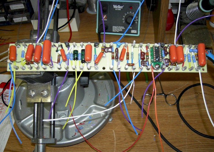 each preamp section. Blue wires carry short runs of signal through the